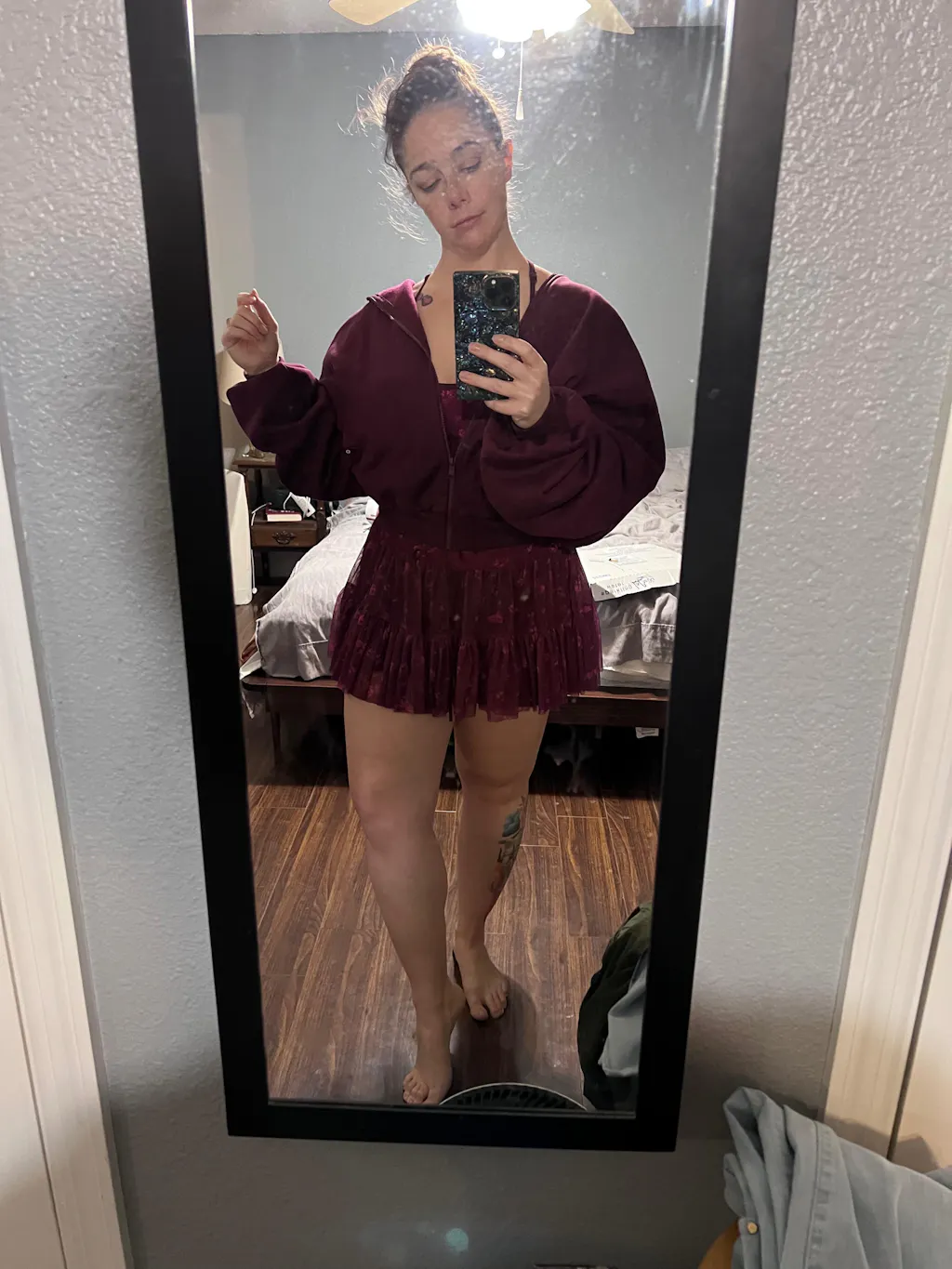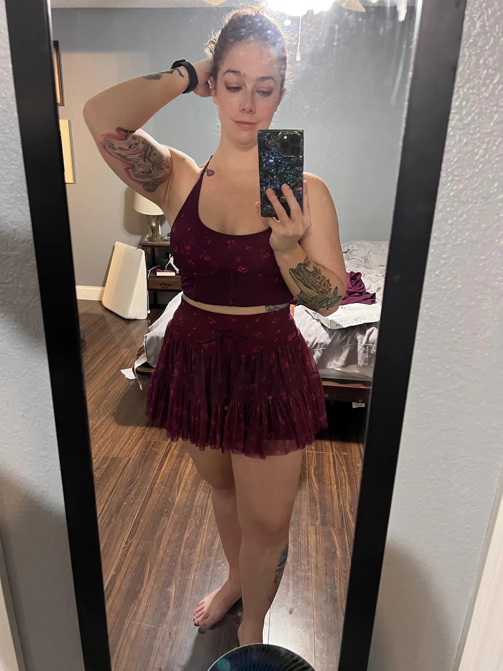 Lilac short skirt. The one that will fit you like skin. Do your research, know the features going in...